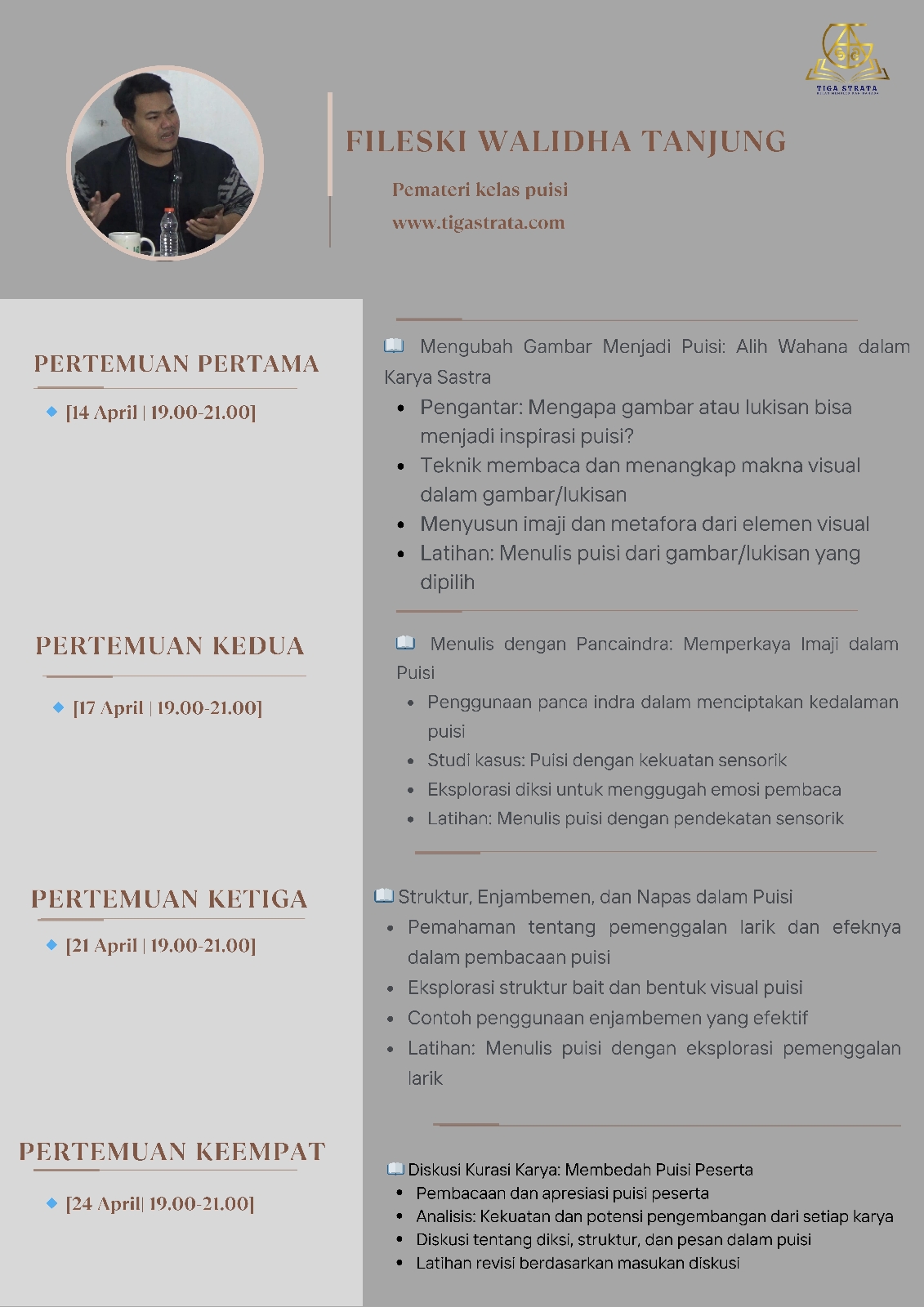 Tiga Strata kembali membuka pendaftaran peserta didik baru. Teman-teman bisa memilih kelas sesuai dengan kebutuhan. Ada tiga kelas yang dibuka, yaitu: Puisi, Cerpen, dan Sastra.